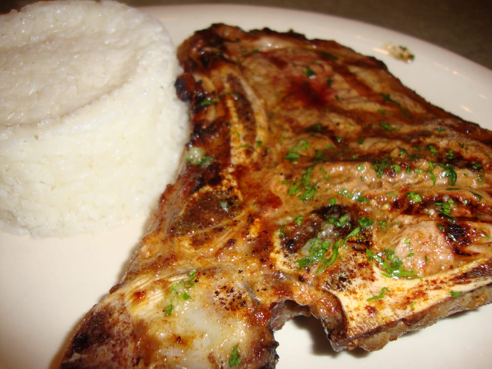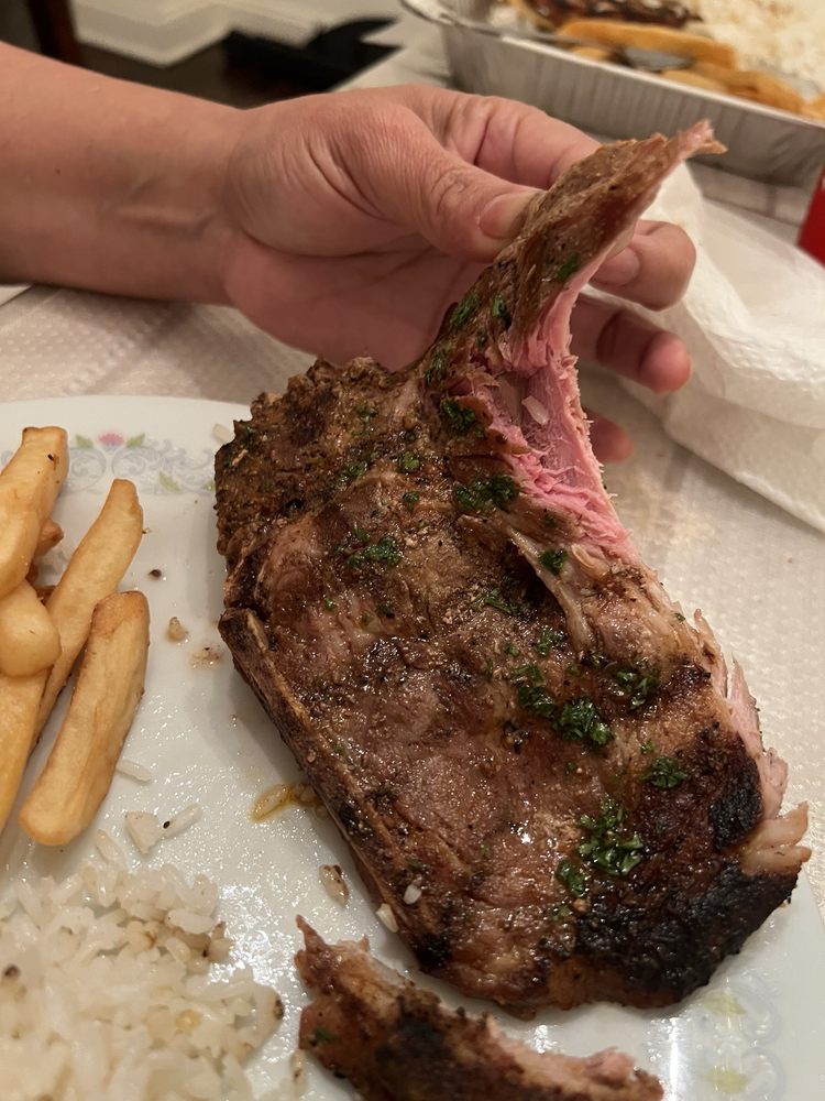 1 sirloin steak, 2 pork chops, 2 chickens, 1 steak beef heart kabob served with golden potatoes. Elija 2 quamiciones con los siguientes platos: arroz, papas fritas o ensalada choose 2 sides with choices below: rice, french fries, or salad